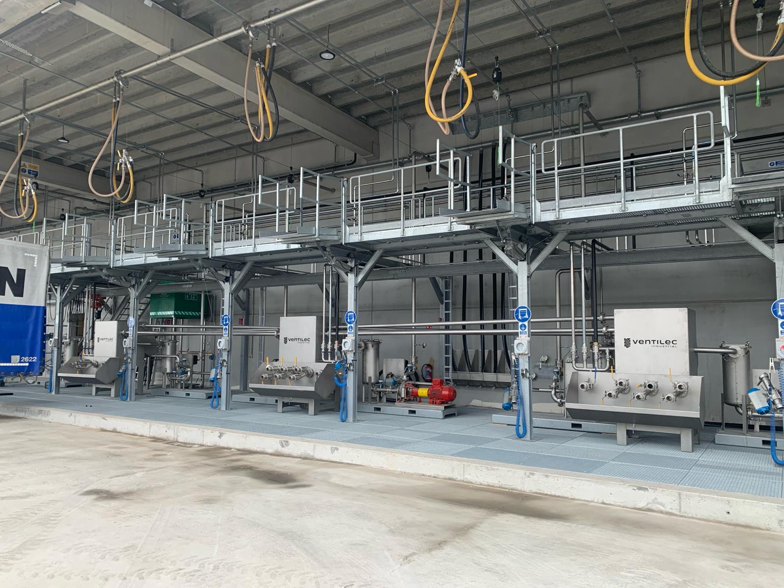 Voor een logistieke klant ontwikkelden wij een groot deel van een compleet afvulcomplex. Ventilec stond in voor het ontwerp en de levering van de loopbordessen met bijhorende cleaning leidingwerk. Dit zodat chauffeurs hun tankwagens veilig en eenvoudig kunnen koppelen en cleanen. Daarnaast leverden wij de pompen en koppelborden die de vloeistoffen gecontroleerd van de tankwagen naar de afvulmachines transporteren.
